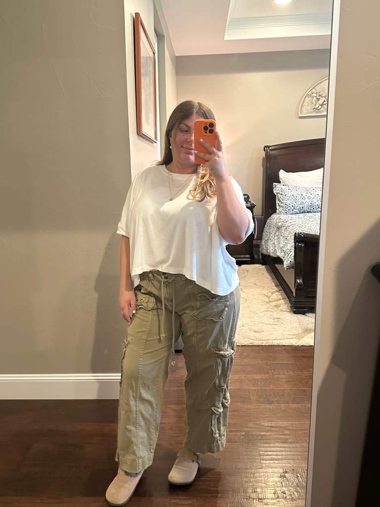 The pants I am wearing are the Tahiti Pant from Free People in Dried Herb, size medium. They have a relaxed fit and feel incredibly comfortable on a shorter frame. I have linked a similar Amazon option for the pants below, and it is funny because I originally bought this style on Amazon. If they ever come back in stock, I will be sure to link them here as well. Also, some slip on clogs give this look an extra touch of boho! I have linked my favorite pair below. They are extremely comfortable, easy to throw on, and go with many different outfits. I wear a size 6.5 and chose the color Taupe, which are featured in the photo above.